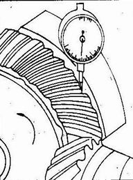其測(cè)量方法是將百分表的觸頭,垂直的壓在大齒輪的大端齒面上,固定小齒輪,然后擺動(dòng)大齒輪,百分表的指針擺動(dòng)范圍即為齒輪的齒側(cè)間隙。