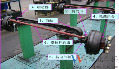 3、前橋構造:前橋主要由前軸、主銷、轉向節、制動器總成、輪轂組合、節臂、橫拉桿總成等組成。(如下圖)