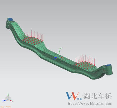 前軸模型采用10節(jié)點(diǎn)四面點(diǎn)單元,與轉(zhuǎn)向節(jié)采用固定連接(見(jiàn)圖1中蘭色標(biāo)記),朝-YC方向沿兩托板垂直各施加力(為額定載荷的2.5倍見(jiàn)圖1中紅色箭頭)。