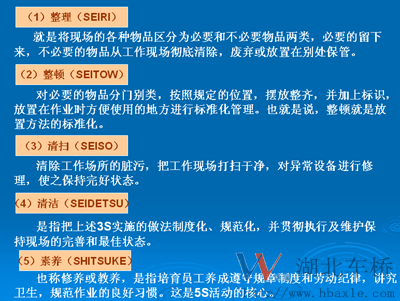 ①現場檢查。②區分必需品和非必需品。③清除非必需品。④處理非必需品。⑤每天循環整理。